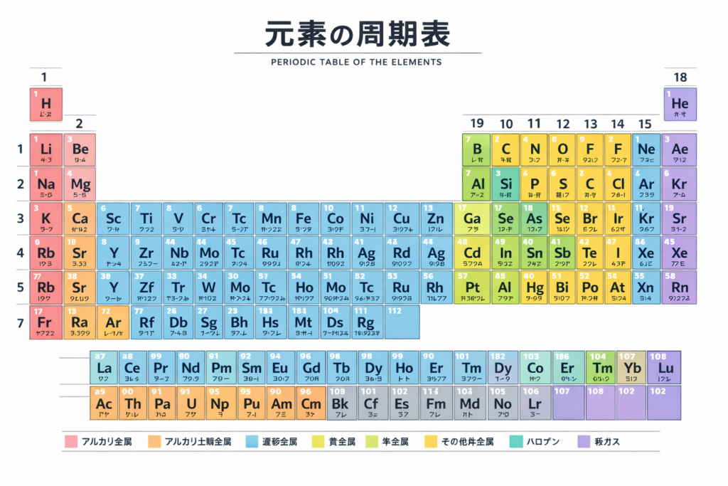 - 元素とは、原子の「種類」のことです。水素、酸素、鉄など、現在118種類が確認されています。