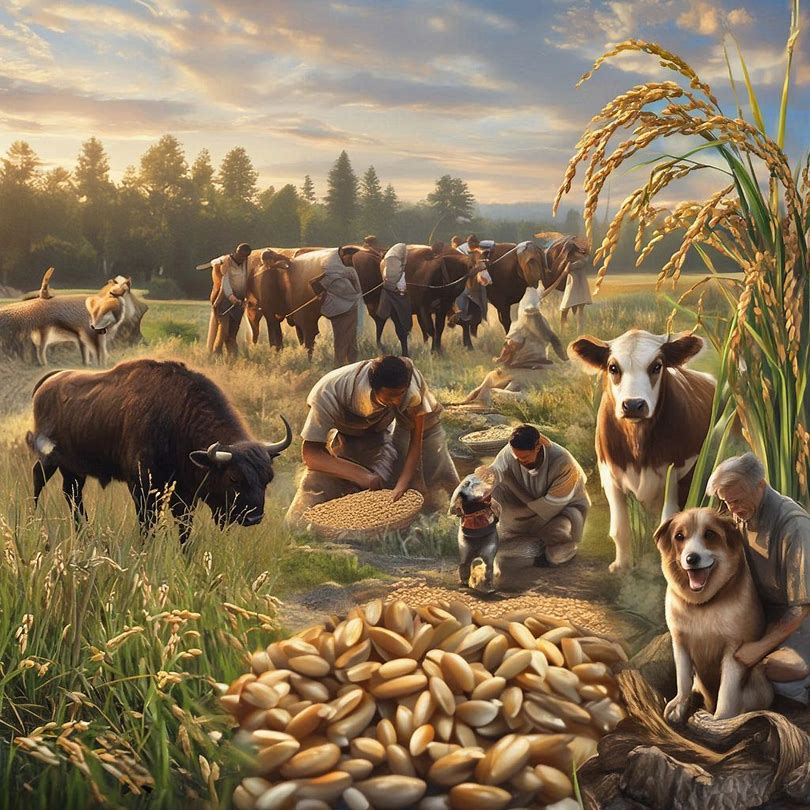 家畜化とは単なる「野生動物を飼い慣らすこと」ではありません。それは数千年から数万年にわたる選抜育種のプロセスであり、その結果として生まれた作物や家畜は、原種とは姿形も性質も大きく異なる存在へと変化しました。イネの粒は数倍に肥大化し、ウシは温和で扱いやすくなり、イヌは人間との共生に最適化された動物となりました。